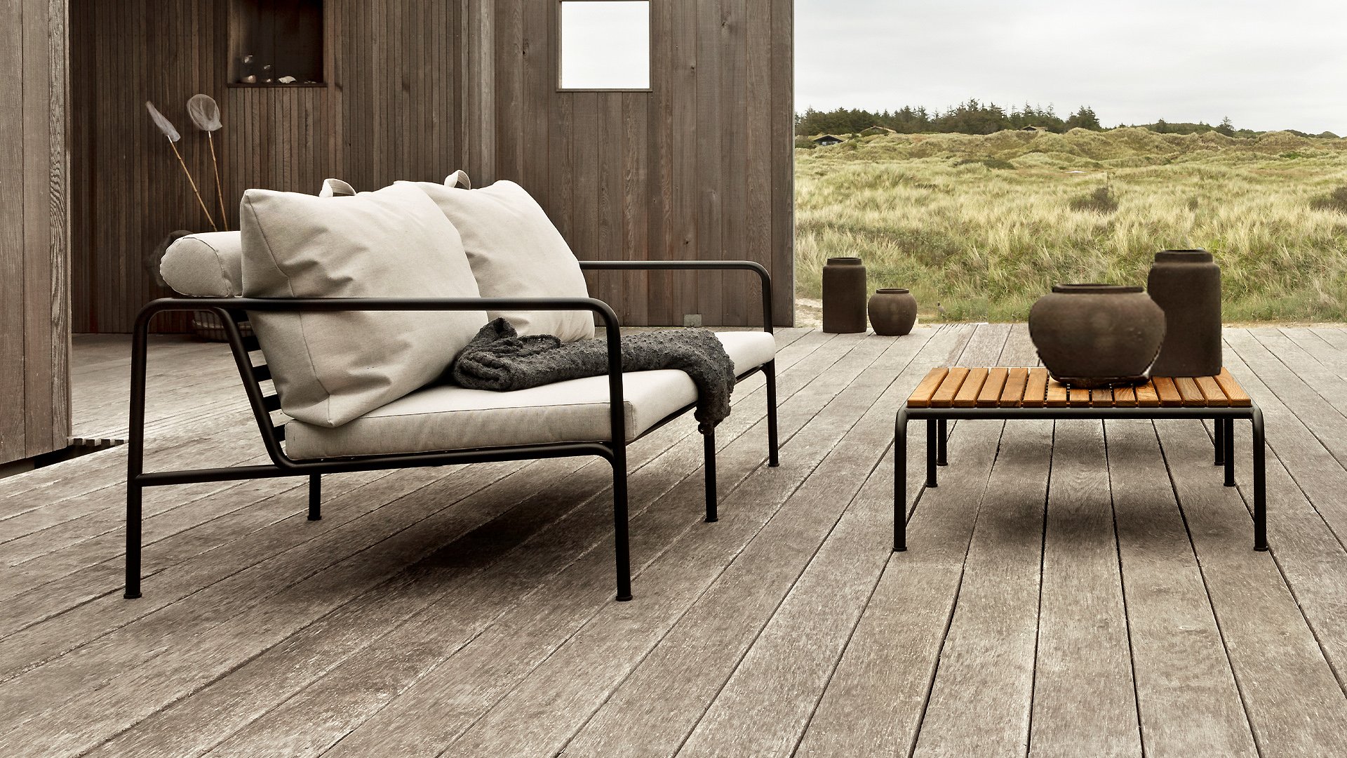 De HOUE AVON-collectie is ontworpen vanuit de wens om iets te creëren met een zeer lichte uitstraling en een laag strak profiel, met behoud van een hoog comfortniveau. Het onderhoudsvrije frame en de constructie van de grote zachte rugkussens is precies dat: de eenvoud van de structuur, waar lage lijnen ervoor zorgen dat het ontwerp er altijd trots uitziet, zowel met als zonder kussens - zomer of winter. De handgrepen van de kussens zijn een statement naar de functie van het product, waardoor ze gemaakt worden om gemakkelijk te pakken en op te bergen indien nodig.