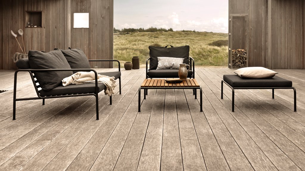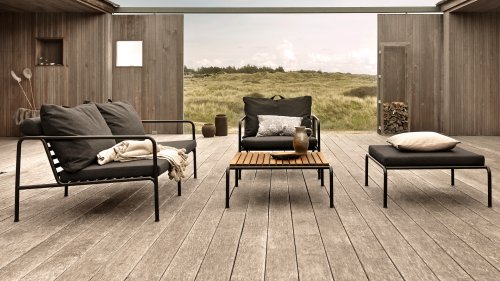 De AVON lounge collectie van Houe bestaat uit een 2-zits bank, een loungestoel en een poef met kussens in Sunbrella Heritage-stof en een loungetafel onderstel, welke kan met of zonder tafelblad in thermo essen worden gebruikt. De frames zijn gemaakt van gepoedercoat zwart staal.