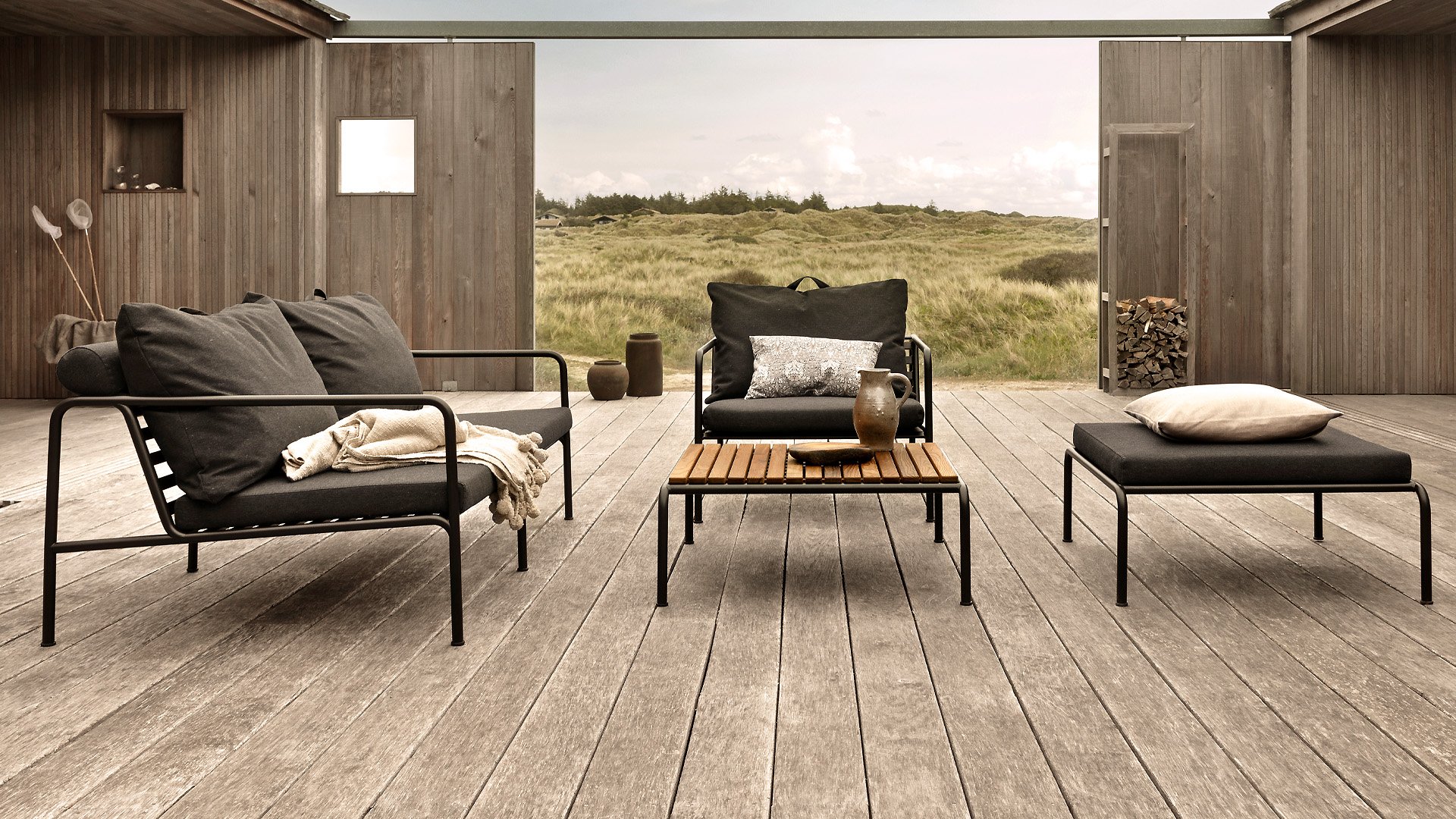 De HOUE AVON-collectie is ontworpen vanuit de wens om iets te creëren met een zeer lichte uitstraling en een laag strak profiel, met behoud van een hoog comfortniveau. Het onderhoudsvrije frame en de constructie van de grote zachte rugkussens is precies dat: de eenvoud van de structuur, waar lage lijnen ervoor zorgen dat het ontwerp er altijd trots uitziet, zowel met als zonder kussens - zomer of winter. De handgrepen van de kussens zijn een statement naar de functie van het product, waardoor ze gemaakt worden om gemakkelijk te pakken en op te bergen indien nodig.