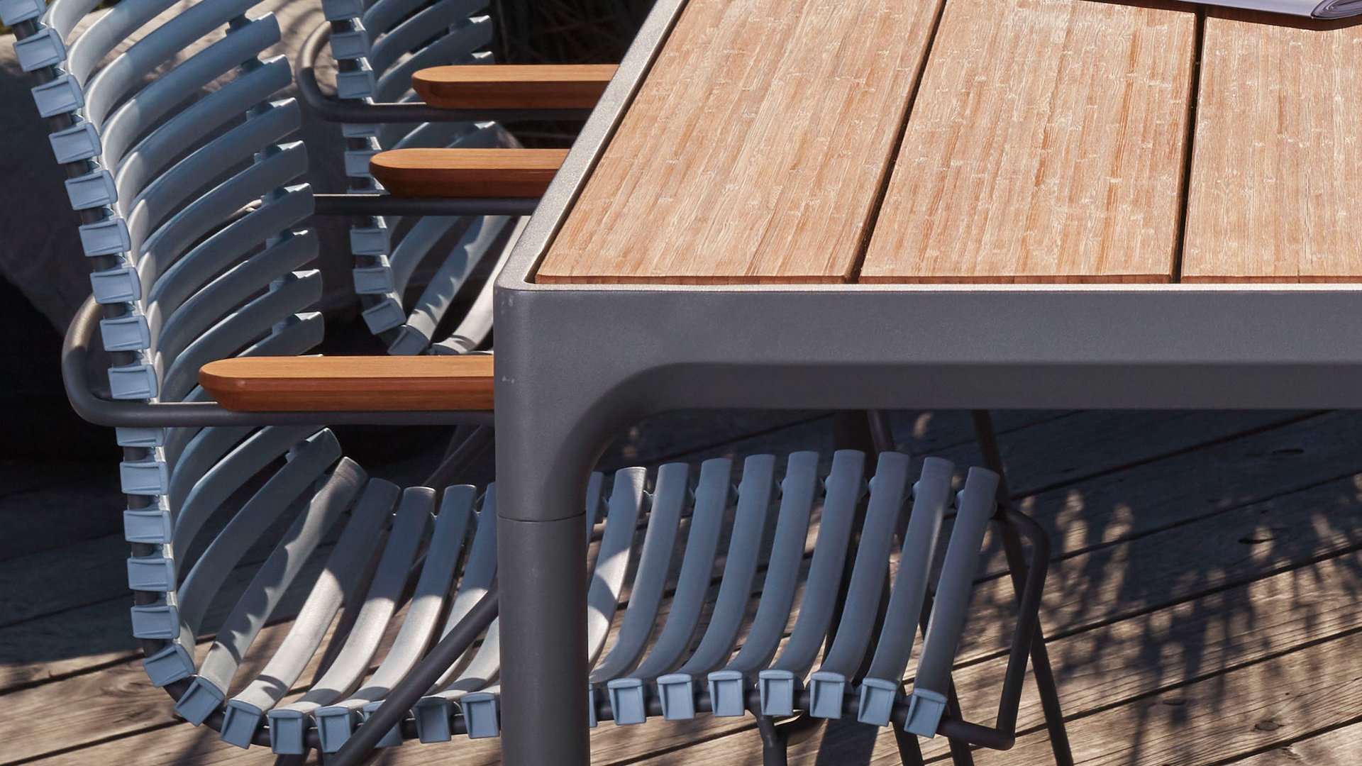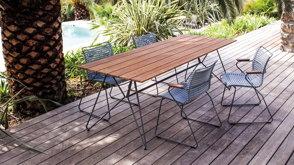 Houe sketch tuintafel met een bamboe blad. Deze prachtige minimalistische tuintafel van het Deense design merk Houe komt in 2 lengtes: 160cm en 210cm. Het onderstel is gemaakt van staal in combinatie met een speciale poedercoating, wat de tafel geschikt maakt om buiten te plaatsen. Deze tafel past perfect bij de Click dining tuinstoelen van Houe, het frame is dezelfde kleur als het frame van de stoelen. Doordat Bamboe veel sneller groeit is het een duurzaam alternatief voor teakhout. Bamboe dient 2-3 keer per jaar geolied te worden, dan behoud het zijn mooie warme kleur.