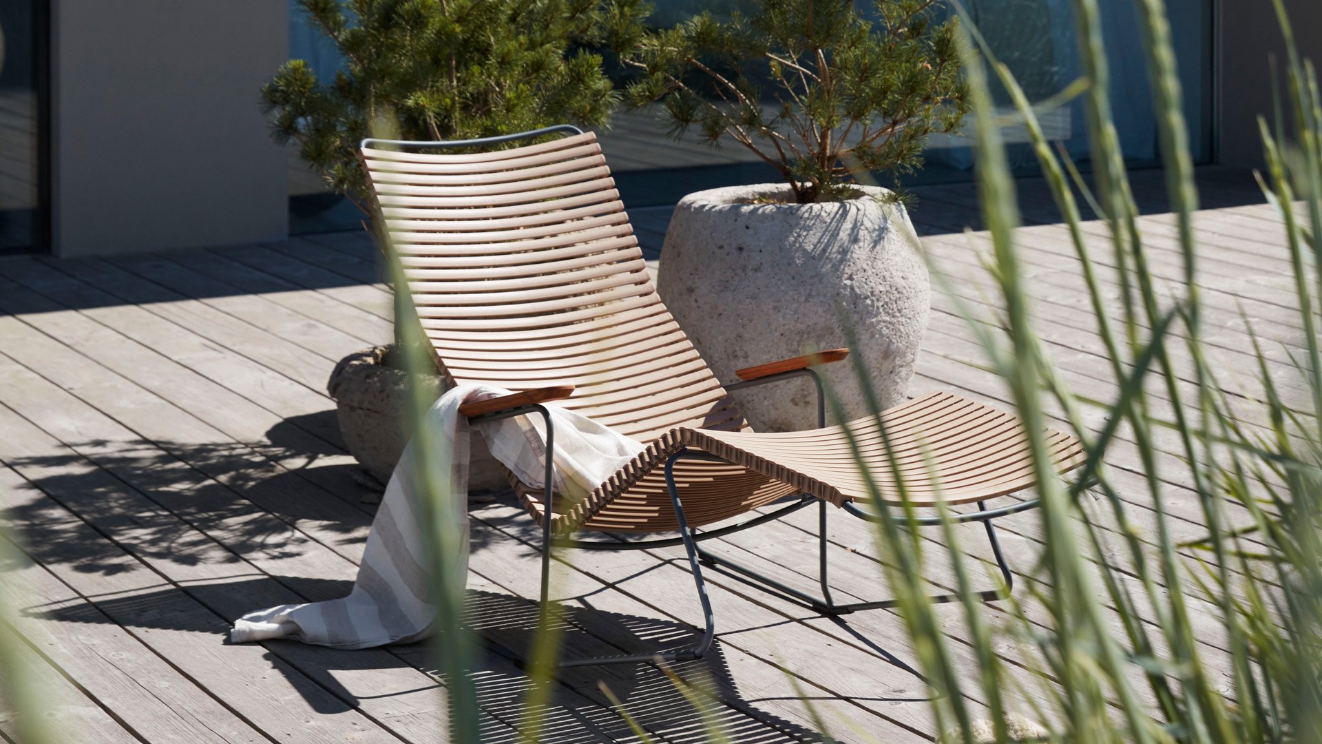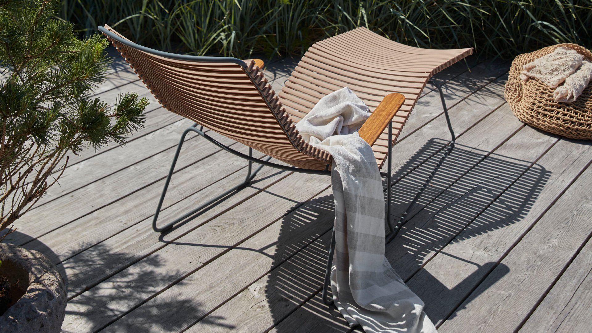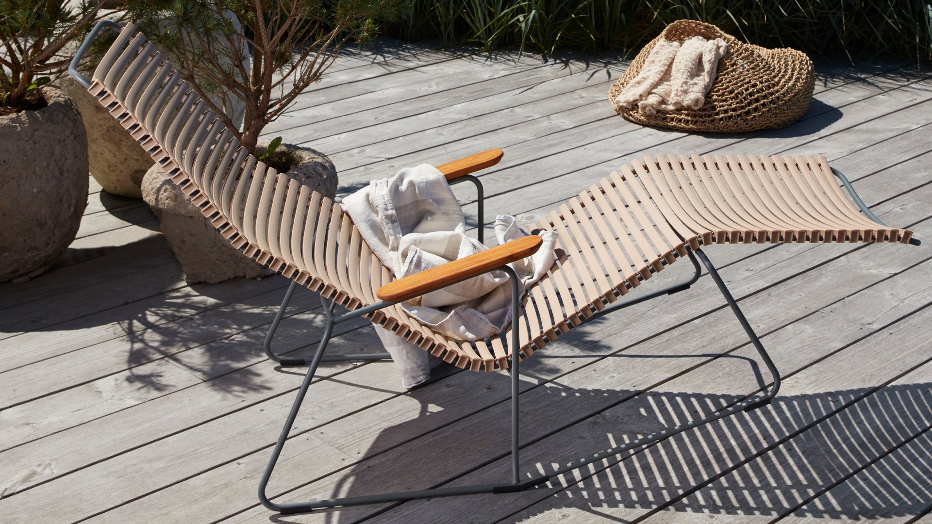 De HOUE Click Sun Ligbedden collectie kenmerkt zich door zijn elegante design in combinatie met praktische bruikbaarheid. De ergonomische vorm in combinatie met de kunstof lamellen zorgt ervoor dat deze stoel heerlijk zit zonder kussen. De bamboe armlegger geeft een mooie contrast, en een natuurlijke tint. Geniet van het heerlijke HOUE Sunrocker ligbed dat kantelbaar is naar een lig en een zitpositie dat is heerlijk zonnen!