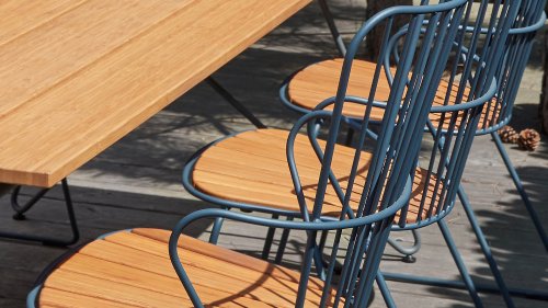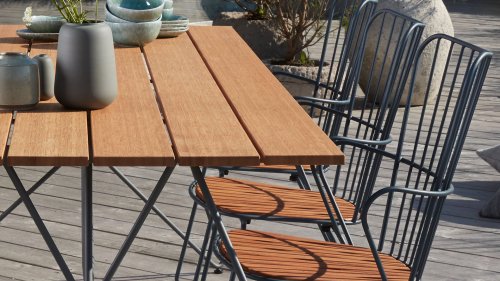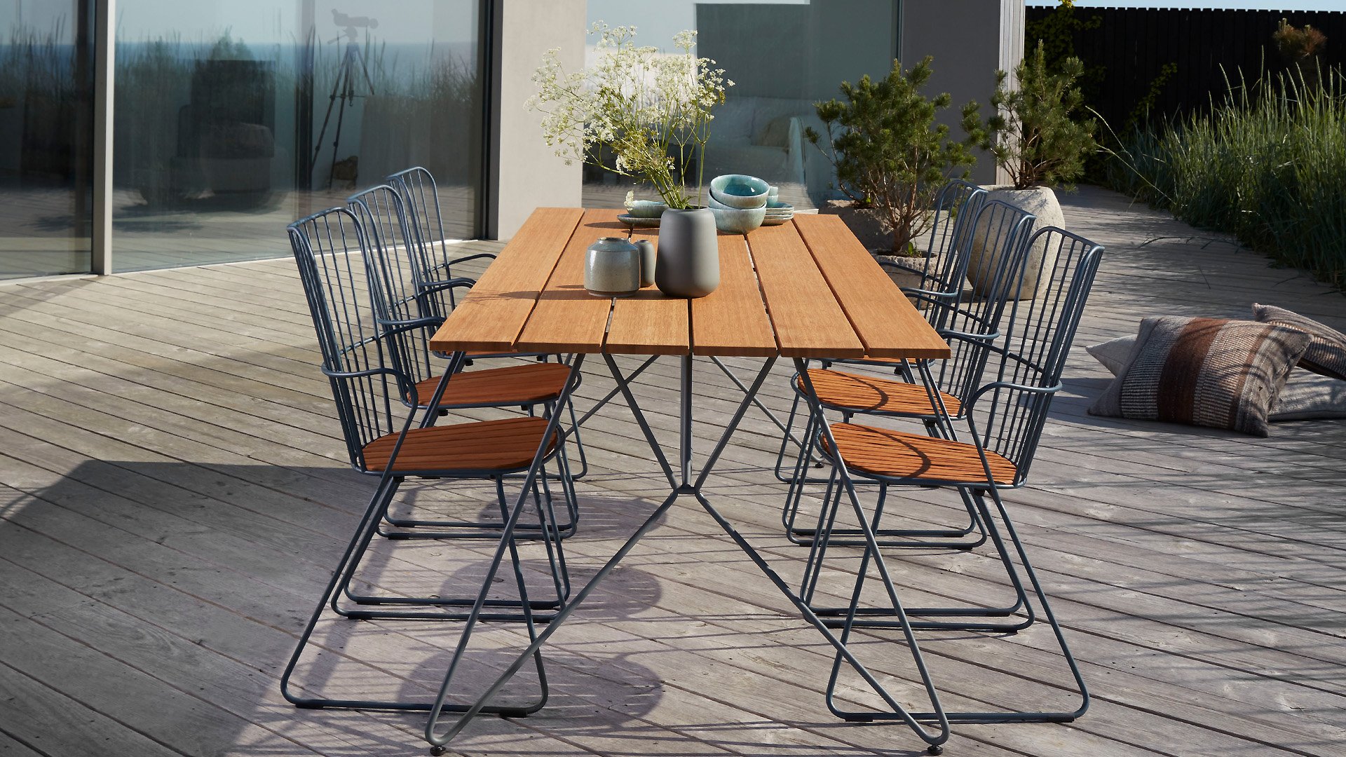 Houe sketch tuintafel met een bamboe blad. Deze prachtige minimalistische tuintafel van het Deense design merk Houe komt in 2 lengtes: 160cm en 220cm. Het onderstel is gemaakt van staal in combinatie met een speciale poedercoating, wat de tafel geschikt maakt om buiten te plaatsen. Deze tafel past perfect bij de Click dining tuinstoelen van Houe, het frame is dezelfde kleur als het frame van de stoelen. Doordat Bamboe veel sneller groeit is het een duurzaam alternatief voor teakhout. Bamboe dient 2-3 keer per jaar geolied te worden, dan behoud het zijn mooie warme kleur.