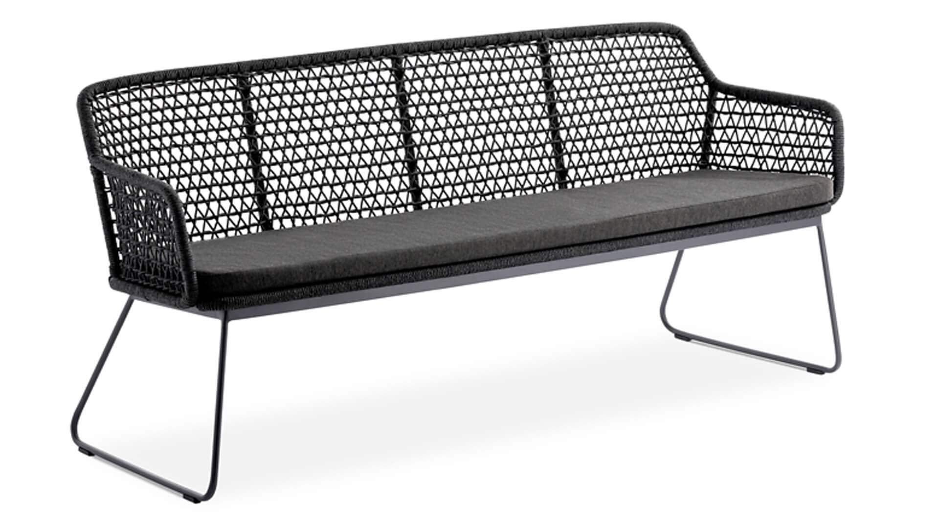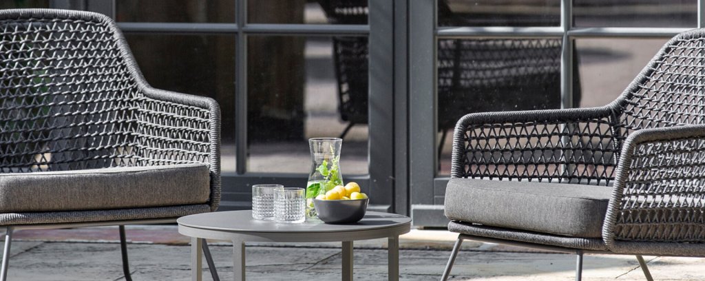 Het Niehoff Kubu frame is omvlochten is met synthetische wicker in de vorm van touw (Rope). De kussens zijn uitgevoerd in een prachtige Southend Antraciet stof. Door de veerkracht van het Rope materiaal en de heerlijke zit-en rugkussens ontstaat een subliem zit-comfort! Deze stof is zeer weerbestendig en duurzaam.