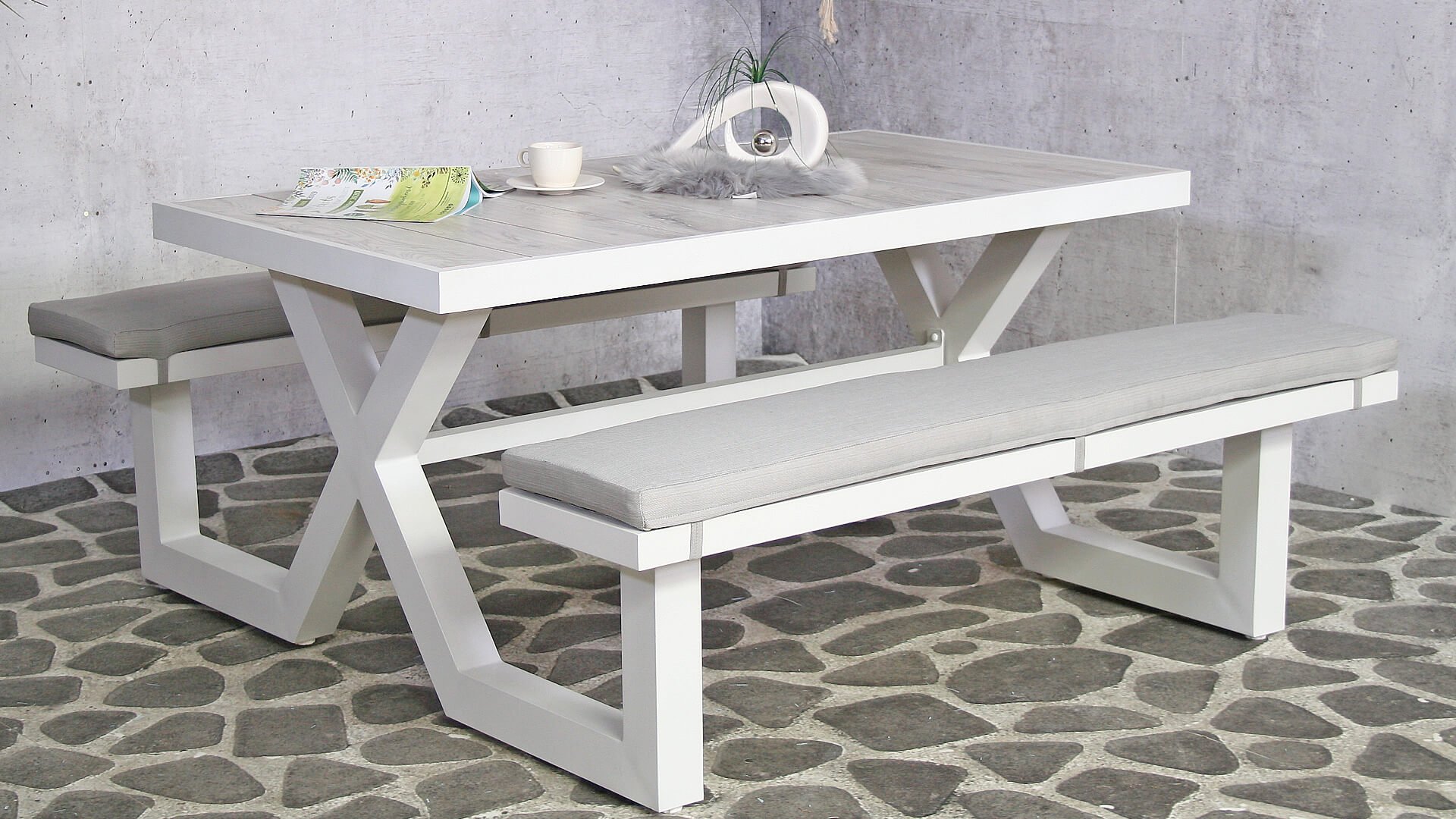 De SenS Galaxy picknick bank heeft een luxe uitstraling. Dit komt door het antraciet of wit kleurige aluminium frame en de strakke robuuste vormen. Aluminium is licht van gewicht, erg stevig en onderhoudsvriendelijk. Het tafelblad is van keramische tegels welke zeer goed krasvast is en eigenlijk onderhousvrij is.