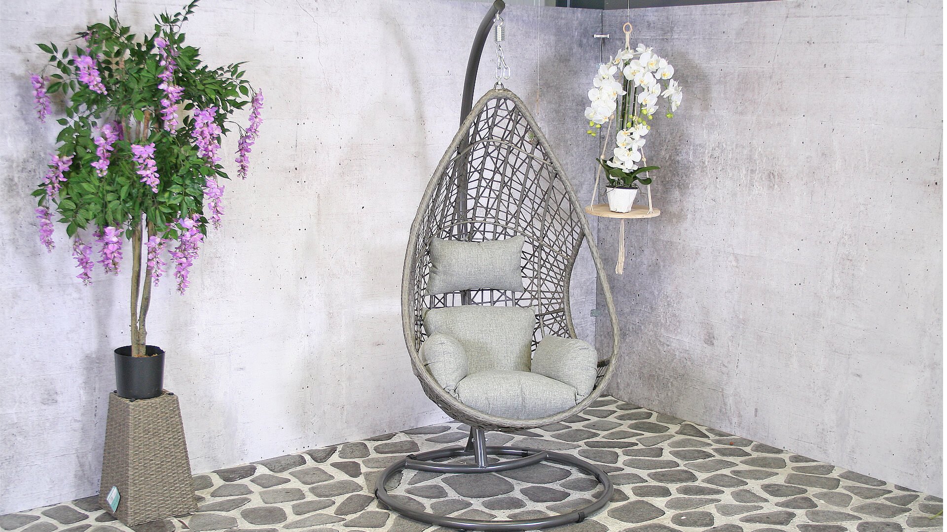 Door de standaard kunt u de stoel gemakkelijk verplaatsen en overal in de tuin neerzetten, in de schaduw, in de zon, op de veranda of op uw terras. Het ei kunt u hoger en lager hangen door middel van de stalen ketting.