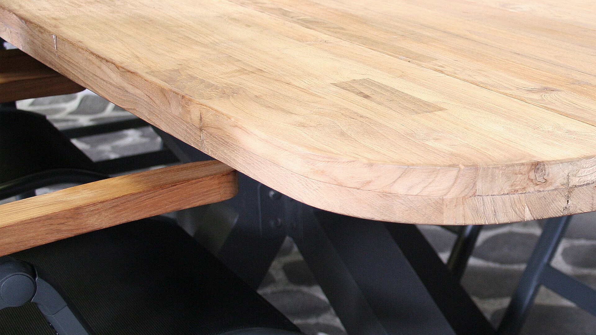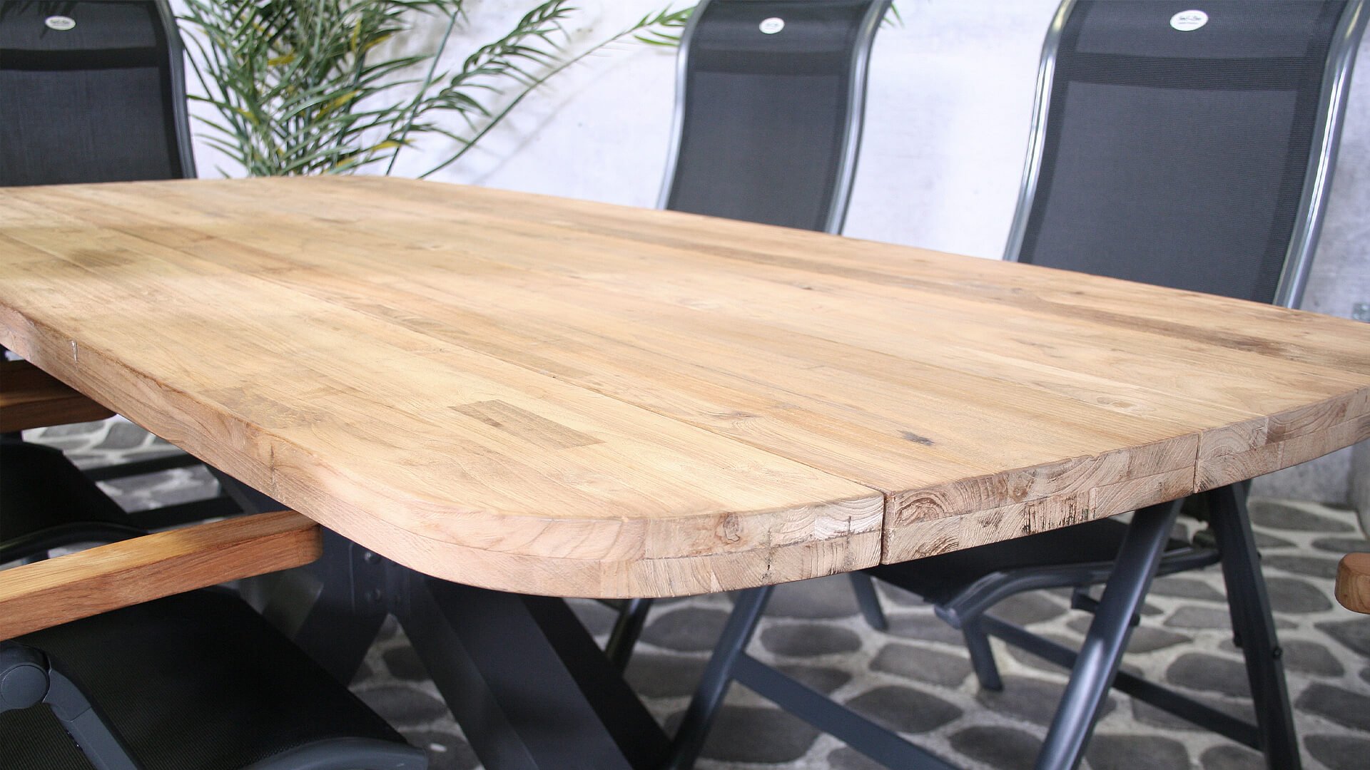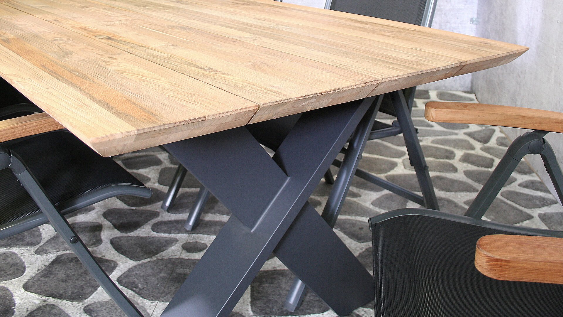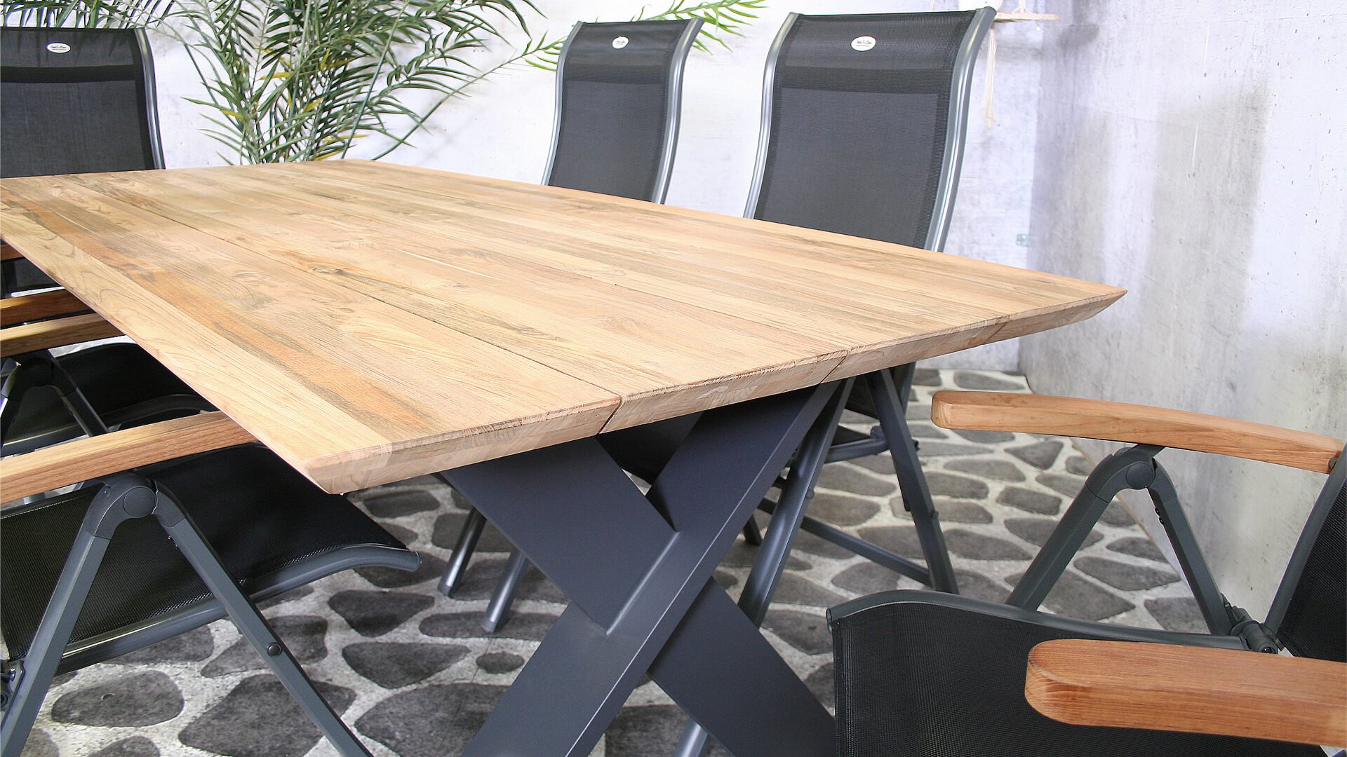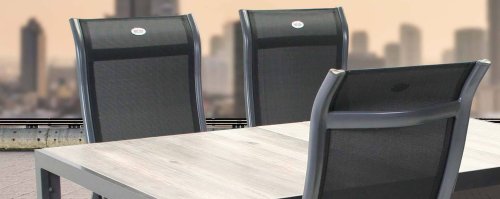 De Sens Torino met teakhoutenarmlegger combineerd prachtig bij de nieuwe SenS-Line Teakhouten tafels met aluminium onderstel.