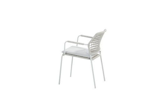 Deze stoel is er in 5 kleuren rope: Antraciet, Groen, Blauw, Frozen en Terra Cotta. Je kijkt hier naar de frozen variant. Je kunt dus kiezen welke kleur het beste past op je terras, of je maakt een mooie combinatie van 2 of zelfs 5 kleuren. Het rope materiaal is weerbestendig en in een blok-patroon geknoopt. Het rope komt op subtiele wijze weer terug in de armleuningen.