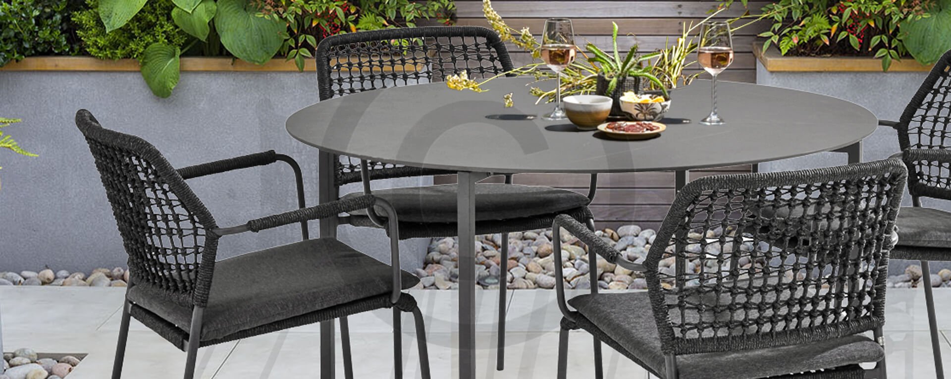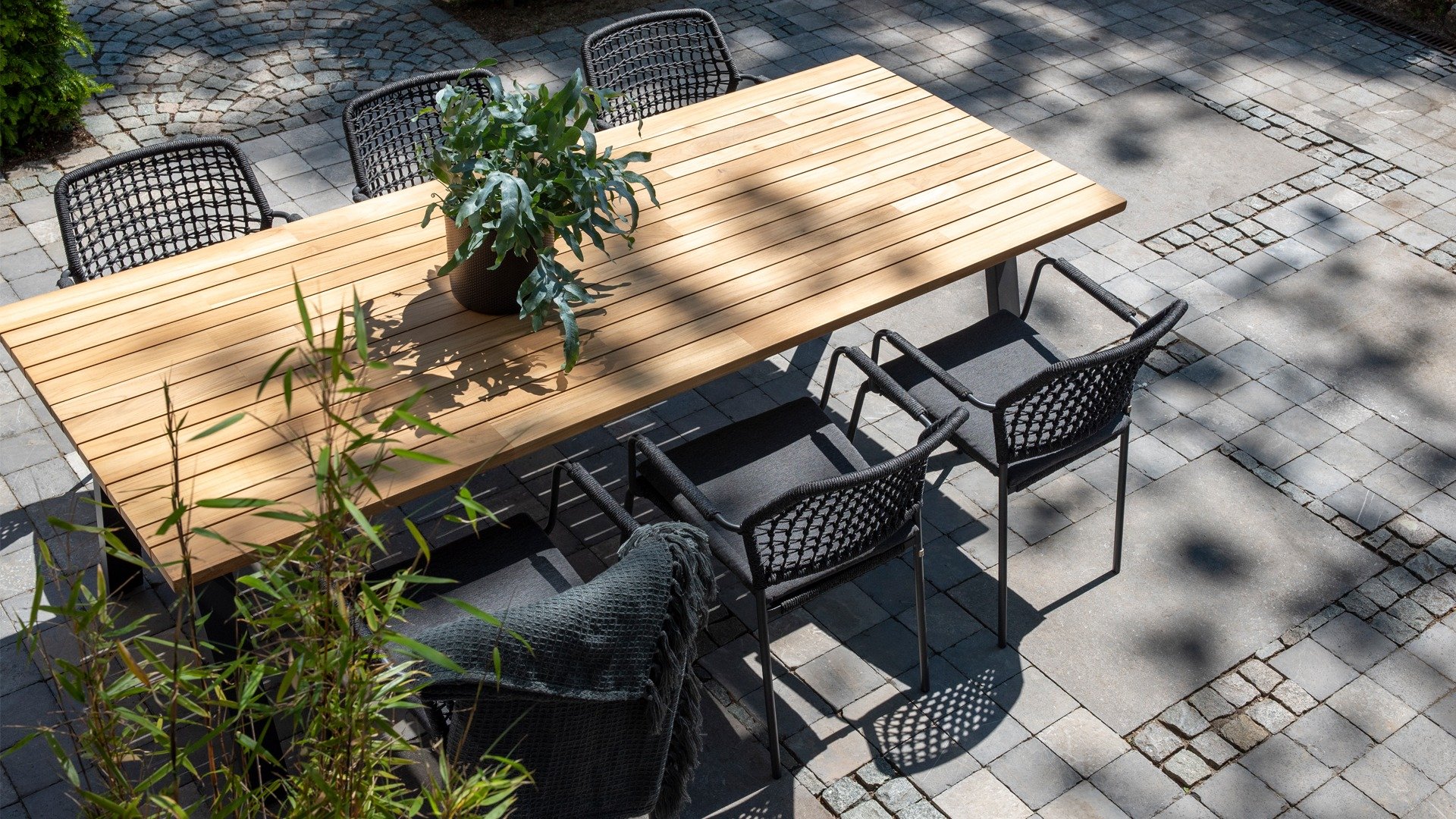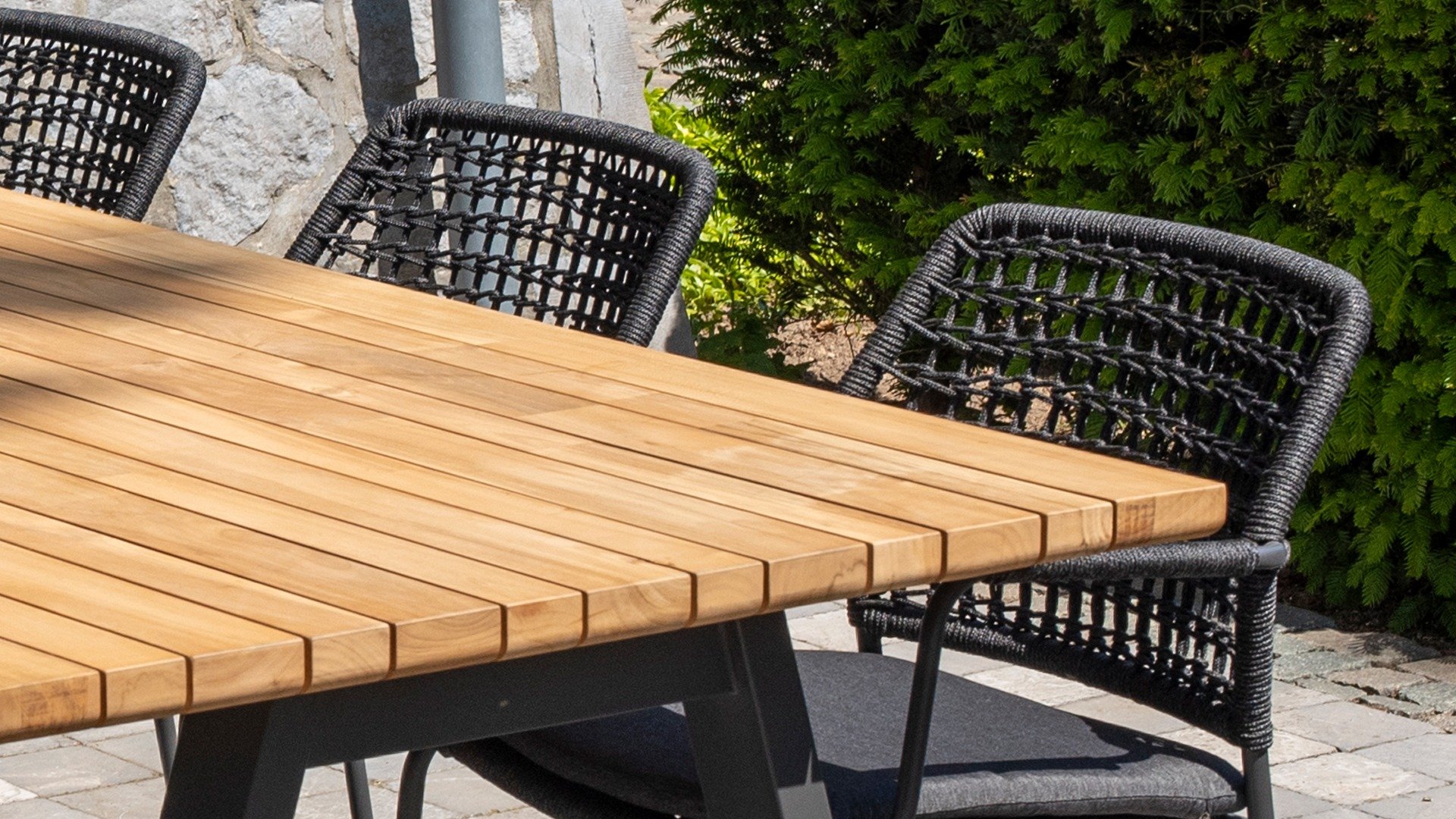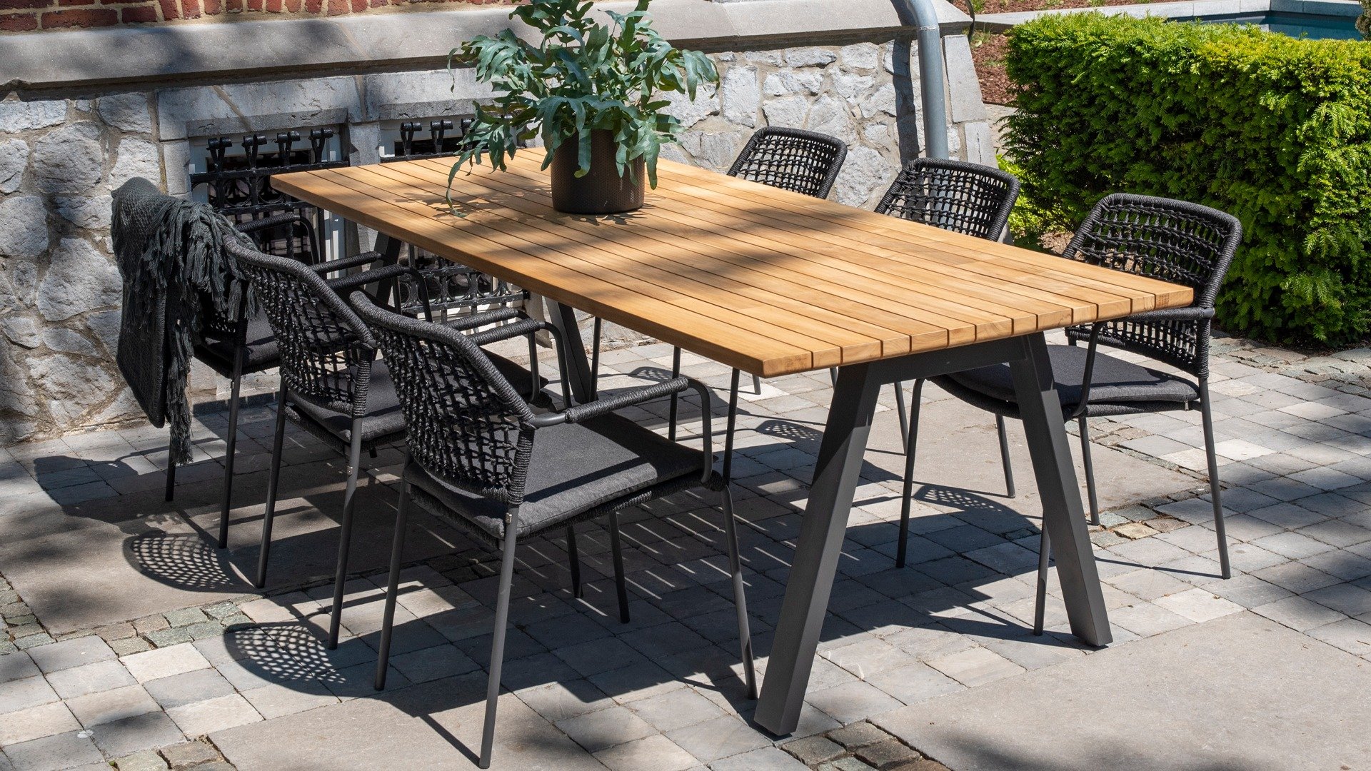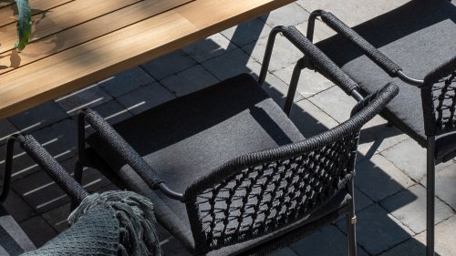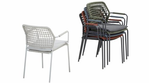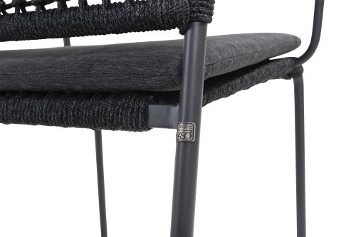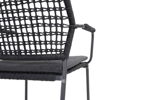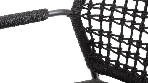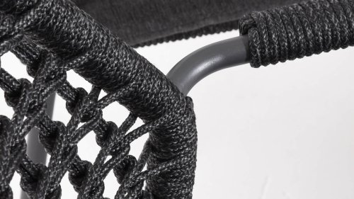 Deze stoel is er in 5 kleuren rope: Antraciet, Groen, Blauw, Frozen en Terra Cotta. Je kijkt hier naar de antraciet variant. Je kunt dus kiezen welke kleur het beste past op je terras, of je maakt een mooie combinatie van 2 of zelfs 5 kleuren. Het rope materiaal is weerbestendig en in een blok-patroon geknoopt. Het rope komt op subtiele wijze weer terug in de armleuningen.