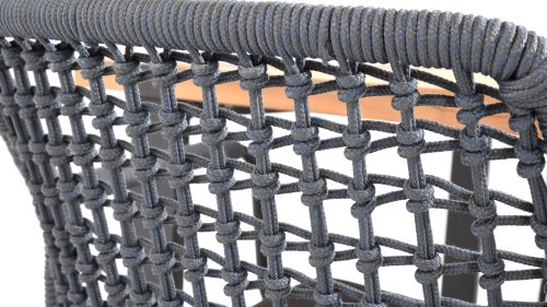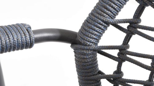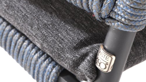 Deze stoel is er in 5 kleuren rope: Antraciet, Groen, Blauw, Frozen en Terra Cotta. Je kijkt hier naar de blauwe variant. Je kunt dus kiezen welke kleur het beste past op je terras, of je maakt een mooie combinatie van 2 of zelfs 5 kleuren. Het rope materiaal is weerbestendig en in een blok-patroon geknoopt. Het rope komt op subtiele wijze weer terug in de armleuningen.