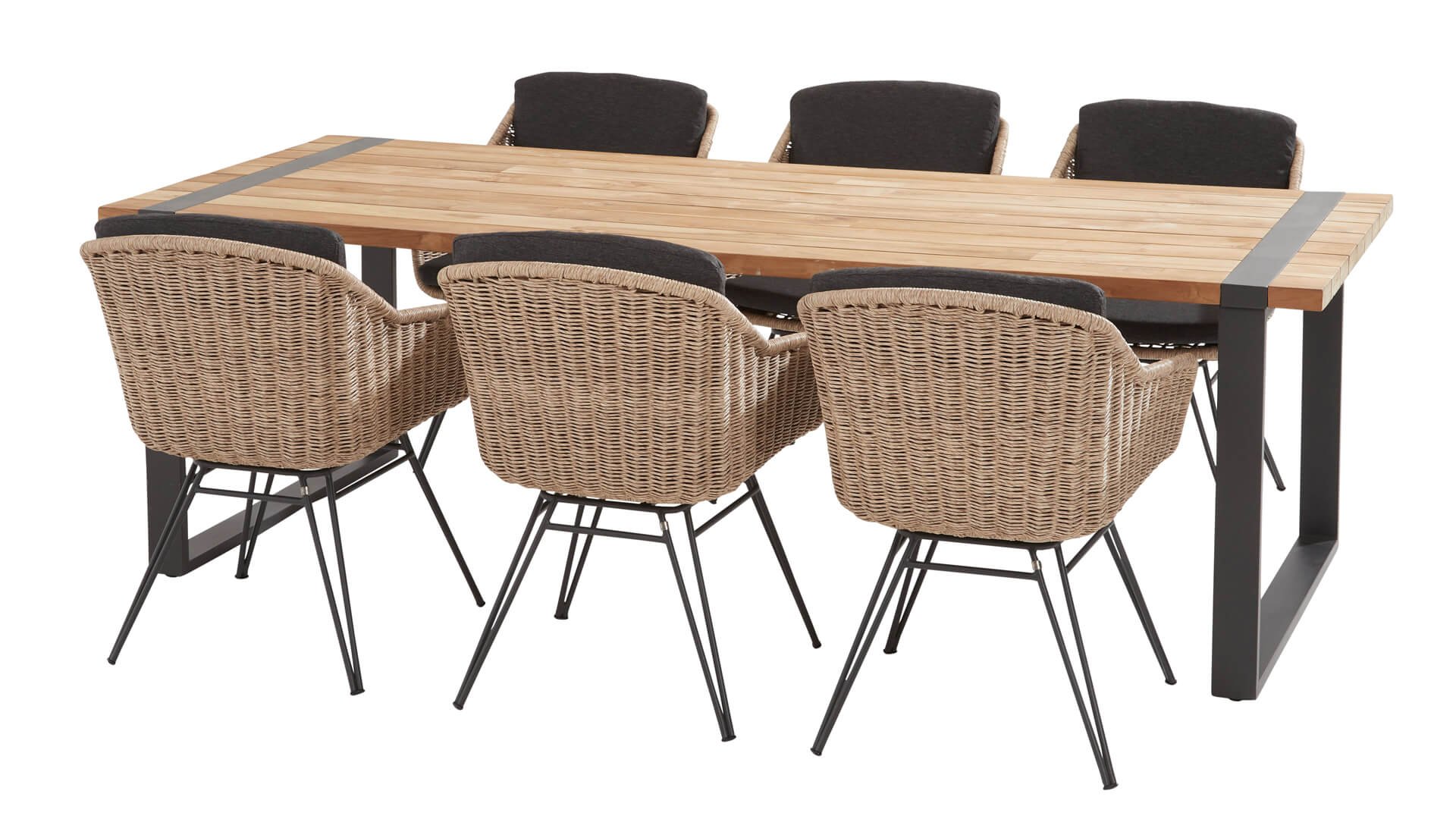 De sterke stof is bestand tegen een regenbui, uitritsbaar en wasbaar. Handig, maar let wel: de kussens zijn waterafstotend. Laat je ze lang in de regen liggen, dan kunnen ze alsnog nat worden aan de binnenkant.