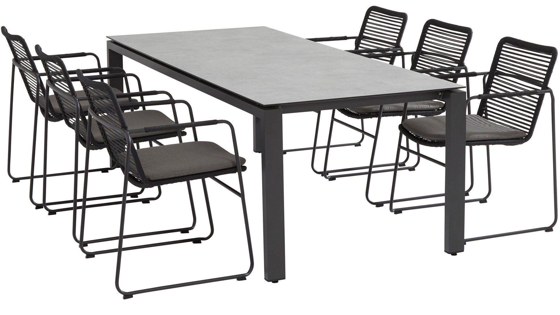 De Elba Diningstoel van Taste by 4Seasons bestaat uit een gepoedercoat RVS frame met strakgespannen Rope. De Rope heeft een harde kern, waardoor hij nauwelijk uitrekt. In combinatie met het standaard meegeleverde zitkussen, is deze stapelstoel erg comfortabel. De onderhoudsvrije Goa tafel met HPL blad is maakt dit tot een strakke tuinset.