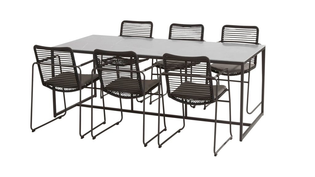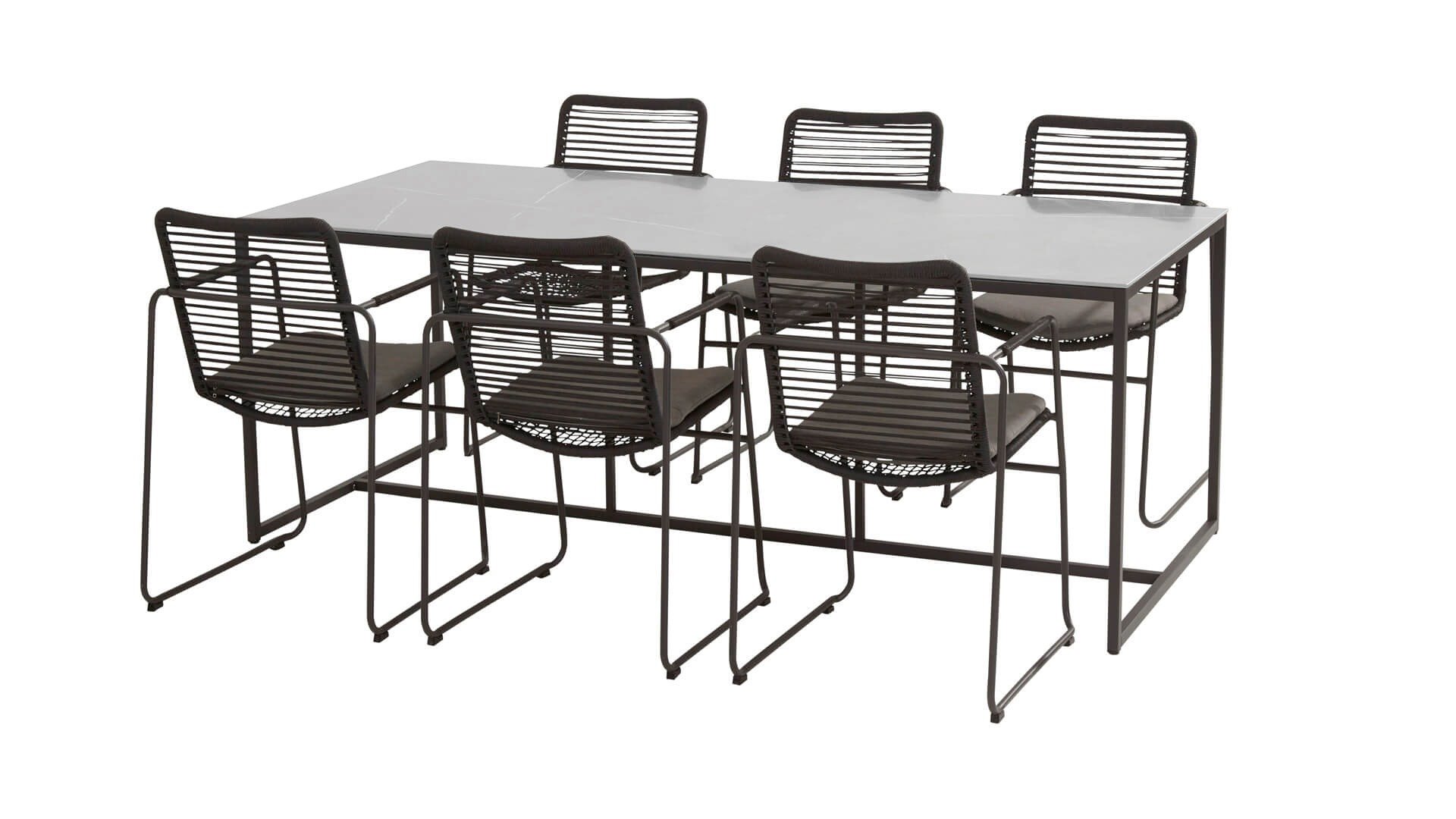 De Elba Diningstoel van Taste by 4Seasons bestaat uit een gepoedercoat RVS frame met strakgespannen Rope. De Rope heeft een harde kern, waardoor hij nauwelijk uitrekt. In combinatie met het standaard meegeleverde zitkussen, is deze stapelstoel erg comfortabel. In combinatie met de warme kleuren van de Basso tafel, is deze diningset een aanwinst in iedere tuin. In combinatie met de Quatro tafel van 4seasons is dit een strak geheel. De tafel is voorzien van een keramiek blad.