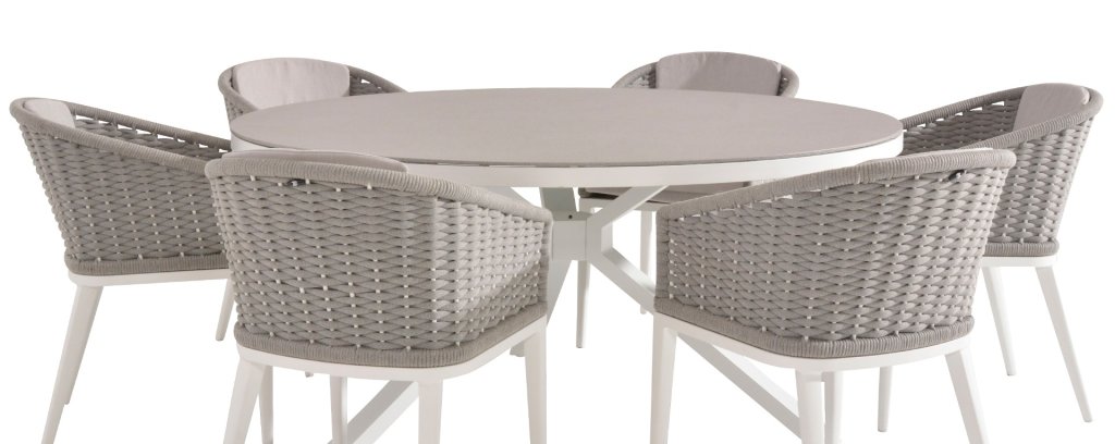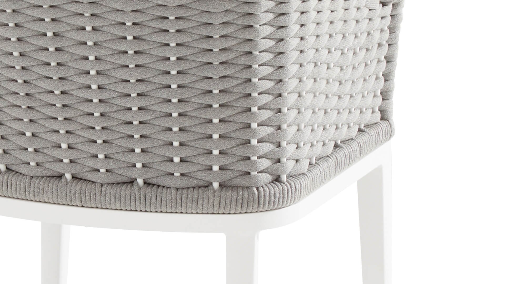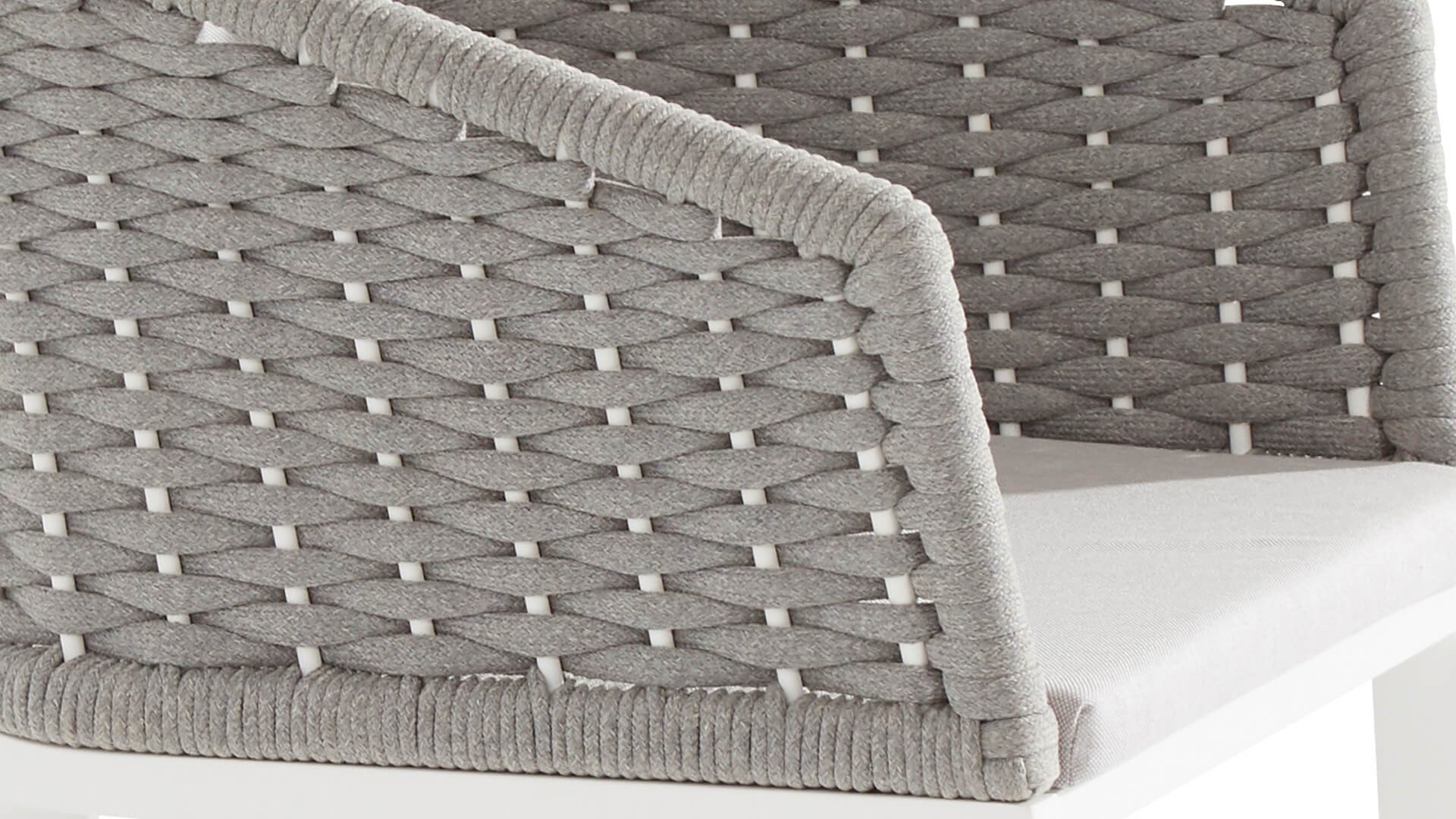 De Taste Portobello Dining is in white aluminium te verkrijgen als ook in het Matt Carbon aluminium, de White is gecombineerd met een Grey kleurig rope en de Matt Carbon met een Antraciete kleurig rope. Het Taste by 4 Seasons Portobello frame is omvlochten en zodanig geweven met synthetische wicker, in de vorm van touw (Rope), dat een comfortabele en "zachte" touch ontstaat.