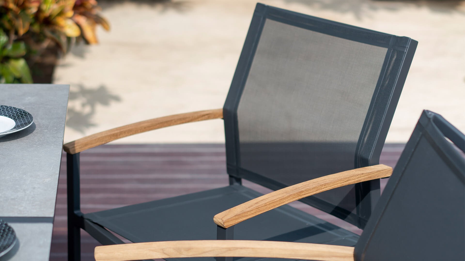 De Zebra Greenline Alex tuinstoel stapelbaar serie. Het frame van gepoedercoat Graphite aluminium is bedekt met een ebony gekleurde Batyline® stof. De Batyline® Textilene dat is gebruikt, is een bewezen synthetische stof die is ademend en scheurvast is voor meerdere jaren. De serie Greenline van Zebra combineert onder andere hedendaagse, ecologie en duurzaamheid met elkaar. In de corporate-concept Greenline is de kwestie van duurzaamheid en de selectie van milieuvriendelijke materialen, die worden verwerkt tot comfortabele, fraai vormgegeven, tijdloze meubels.