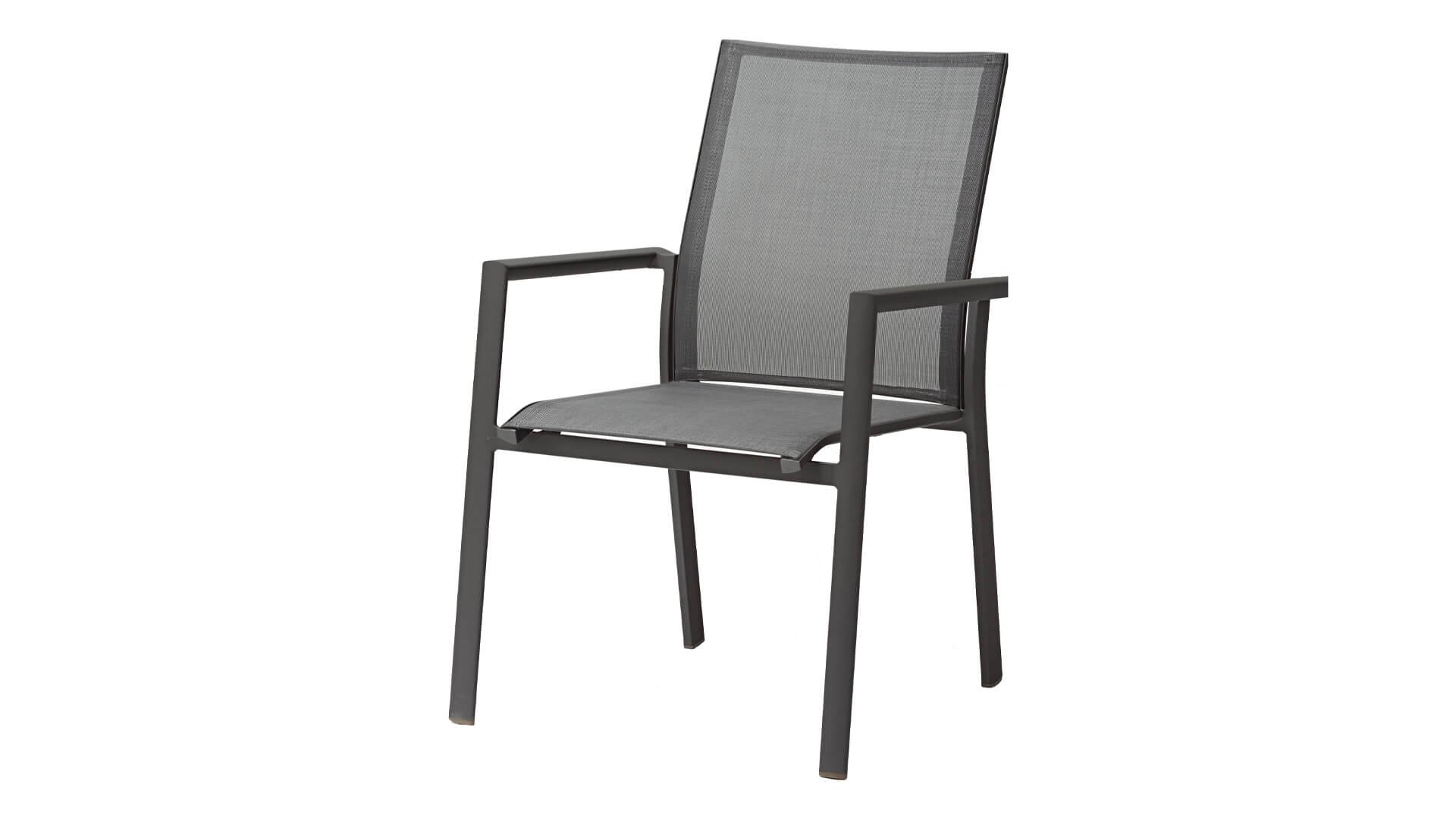 De Zebra Greenline Fly serie. Het frame van gepoedercoat aluminium Graphite, Elegance grey of RVS. Deze serie is bedekt met een Dark grey gekleurde Batyline® stof. De Batyline® Textilene dat is gebruikt, is een bewezen synthetische stof die is ademend en scheurvast is voor meerdere jaren. De serie Greenline van Zebra combineert onder andere hedendaagse, ecologie en duurzaamheid met elkaar. In de corporate-concept Greenline is de kwestie van duurzaamheid en de selectie van milieuvriendelijke materialen, die worden verwerkt tot comfortabele, fraai vormgegeven, tijdloze meubels.