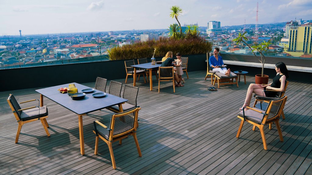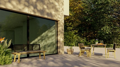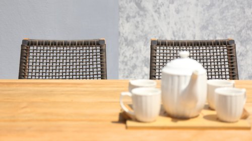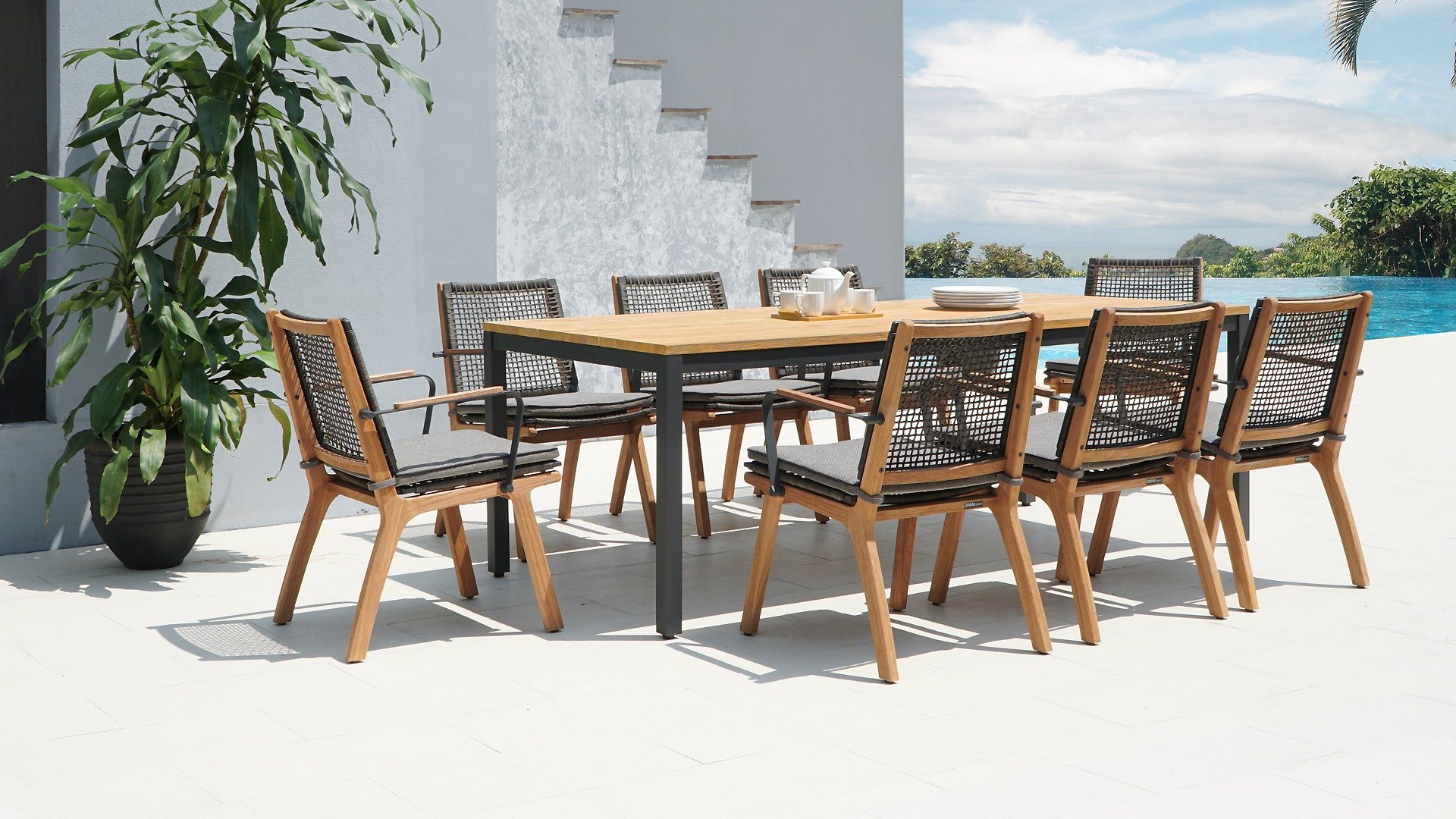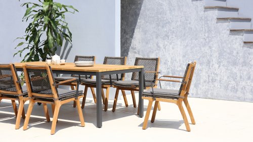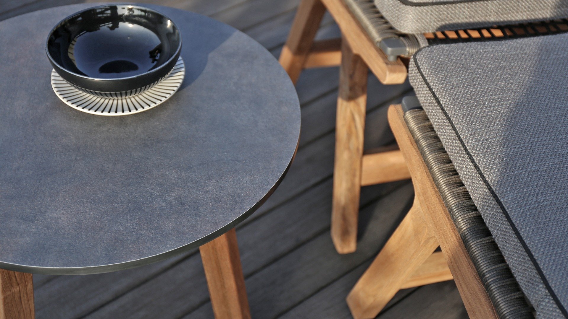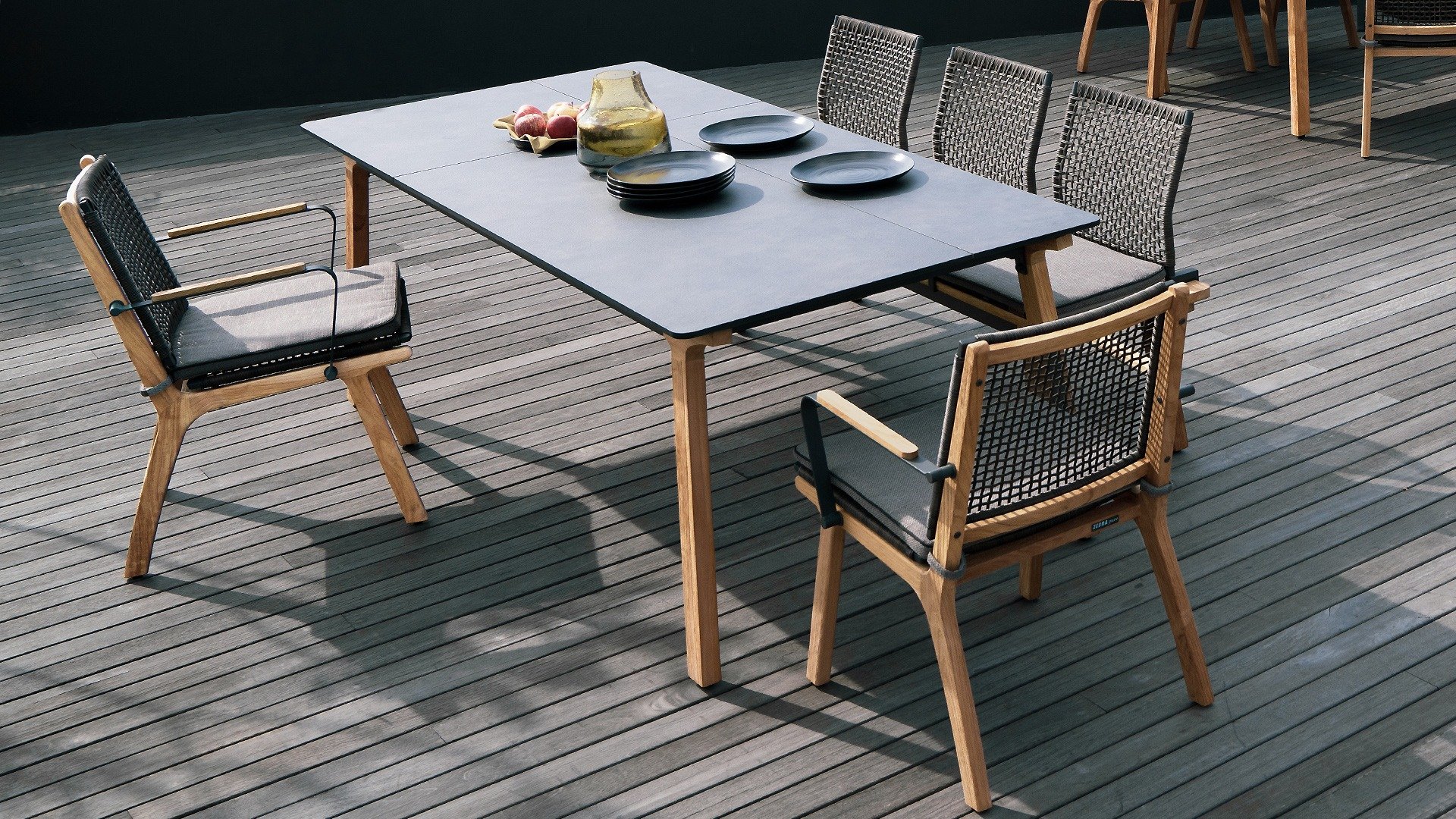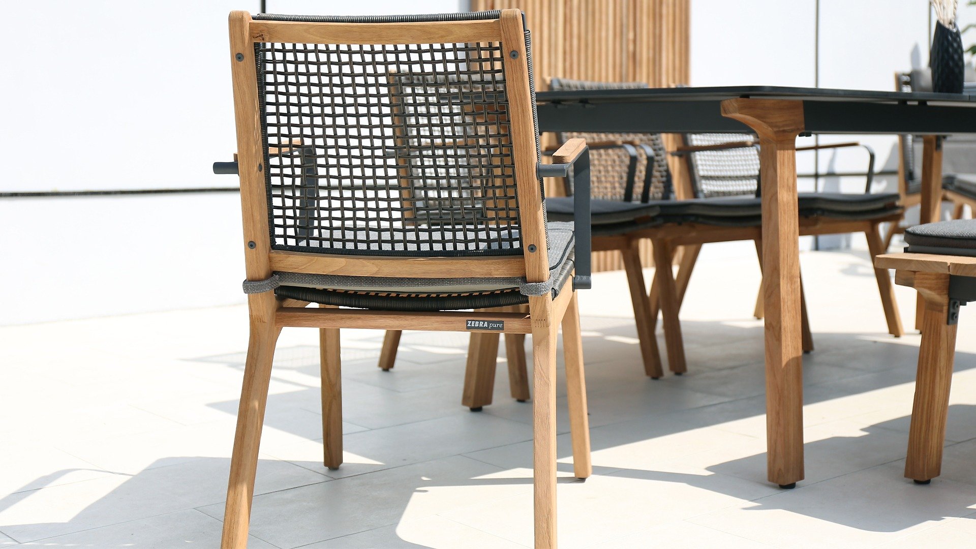 Het harmonieuze en tegelijkertijd contrasterende kleurenspel van de tafel Lenyx is ook terug te vinden in de bijpassende zitmeubels van de serie: een frame van gepoedercoat aluminium in "grafiet" gevlochten met touwstof in "bruin-geborsteld" vormt de zitting en rugleuning, die is gemaakt door één stevig frame van geborsteld teak. Filigrane armleuningen van gepoedercoat aluminium en teak zien er elegant en onopvallend uit. De 3-zits bank uit de serie ZEBRA pure Lenyx is gemaakt van geborsteld teak. De zitting en rugleuning van touwstof vormen een eenheid en worden op de bank geplaatst voor nog meer comfort.