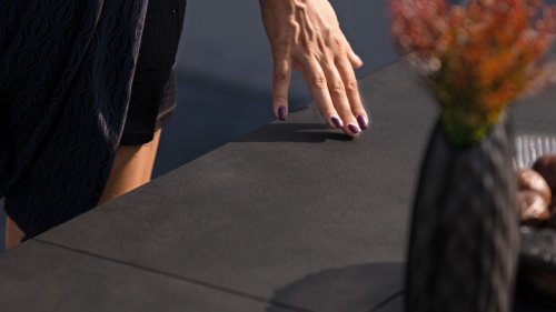 Zittingen van hoogwaardig textiel en bijpassende zitkussens van waterdichte Sunny Guard-stof in de kleur "macchiato" zien er gezellig uit en nodigen uit om te blijven hangen. De nieuwe Zebra greenline lounge bestaat uit verschillende elementen die naar believen met elkaar gecombineerd kunnen worden. De selectie van elementen varieert van 3-zits, 2-zits of fauteuil tot de Max Lounge hoek, een kruk en het Max Lounge verbindingsblad. De gezellige lounge MAX is optioneel ook te combineren met twee verschillende maten salontafels of een eettafel. De eettafel "grafiet" aluminium met een breedte van 140 centimeter biedt voldoende ruimte om comfortabel zittend te kunnen dineren.