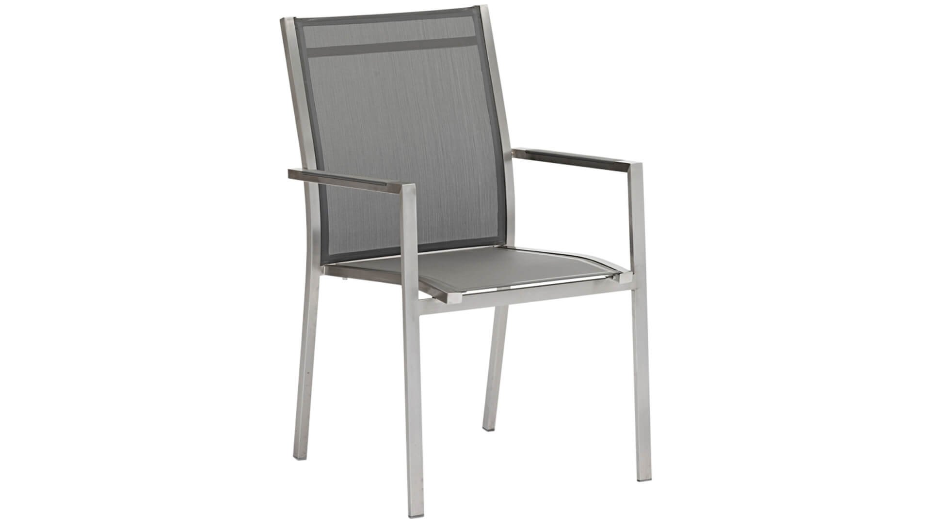 De Zebra One serie. Het frame van geborsteld roestvrij staal is bedekt met een Dark grey of Dark platinum gekleurd textilenen stof. Deze RVS stapelstoel 'One' van Zebra is niet alleen een ergonomisch geperfectioneerde stoel, maar overtuigt ook door het minimalistische ontwerp en fijn verzonken teakhouten of textilene armleuning in roestvrijstaal. De Zebra One tuinstoel kenmerkt zich door een hogere rugleuning als gewoon is voor stapelstoelen en creëert daarmede een heerlijk zit-comfort. Tevens is er in dezelfde Zebra One serie de verstelbare/inklapbare stoel.