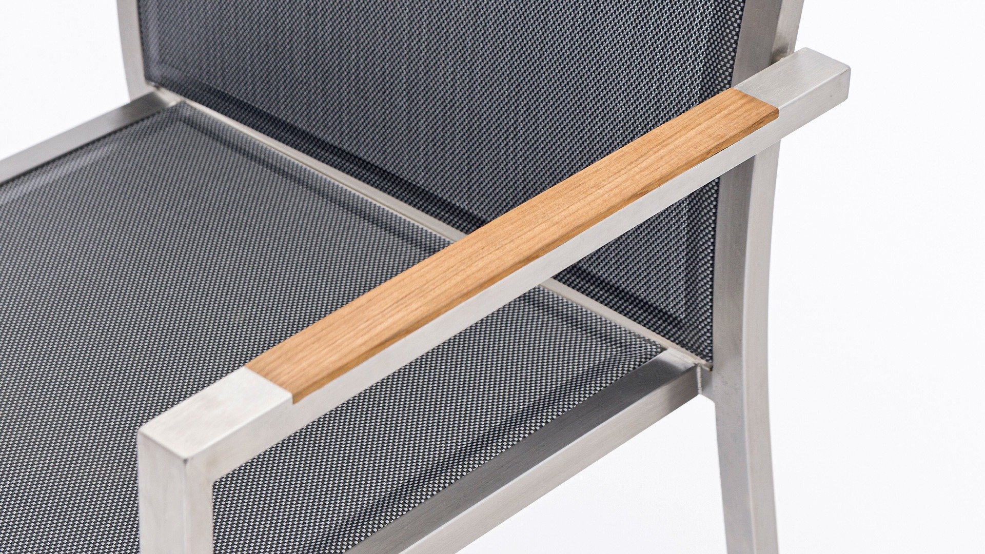 De Zebra One serie. Het frame van geborsteld roestvrij staal is bedekt met een Dark grey of Dark platinum gekleurd textilenen stof. Deze RVS stapelstoel 'One' van Zebra is niet alleen een ergonomisch geperfectioneerde stoel, maar overtuigt ook door het minimalistische ontwerp en fijn verzonken teakhouten of textilene armleuning in roestvrijstaal. De Zebra One tuinstoel kenmerkt zich door een hogere rugleuning als gewoon is voor stapelstoelen en creëert daarmede een heerlijk zit-comfort. Tevens is er in dezelfde Zebra One serie de verstelbare/inklapbare stoel.