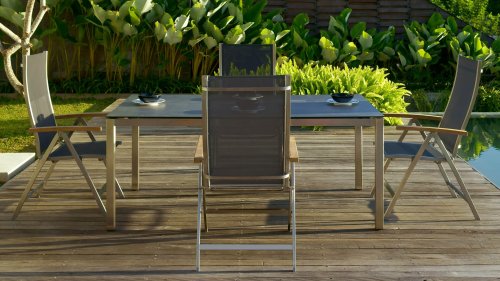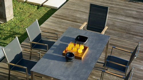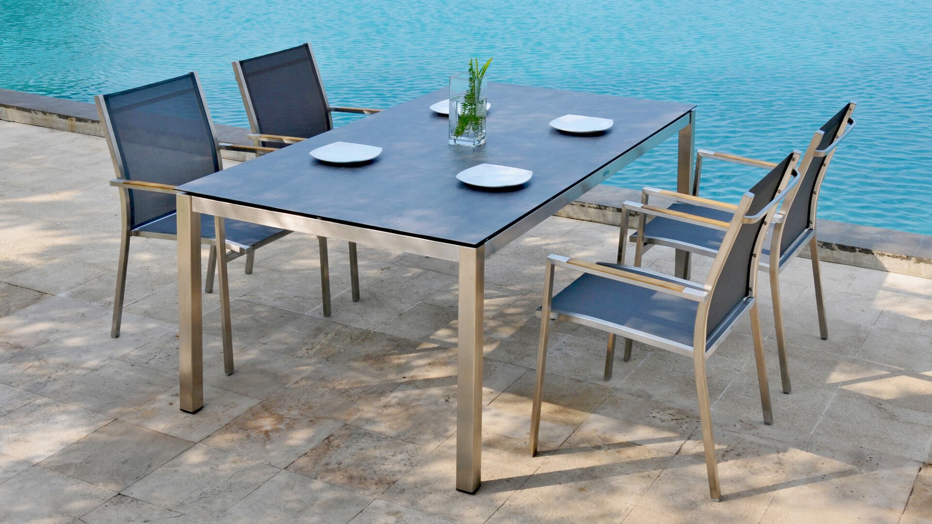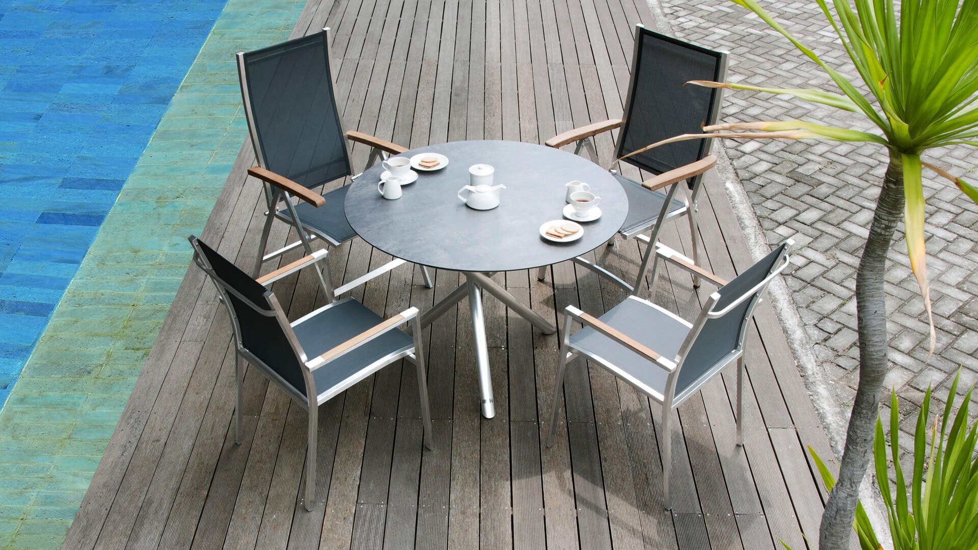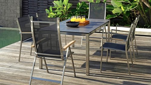 De Zebra One Dining: Het frame van geborsteld roestvrij staal is bedekt met Dark grey of Dark platinum gekleurde textilenen stof. Deze RVS stapelstoel 'One' van Zebra is niet alleen een ergonomisch geperfectioneerde stoel, maar overtuigt ook door het minimalistische ontwerp en fijn verzonken teakhouten armleuning in roestvrijstaal. De Zebra One tuinstoel kenmerkt zich door een hogere rugleuning als gewoon is voor stapelstoelen en creëert daarmede een heerlijk zit-comfort. Tevens is er in deze serie stapelbare en verstelbare stoelen te verkrijgen.