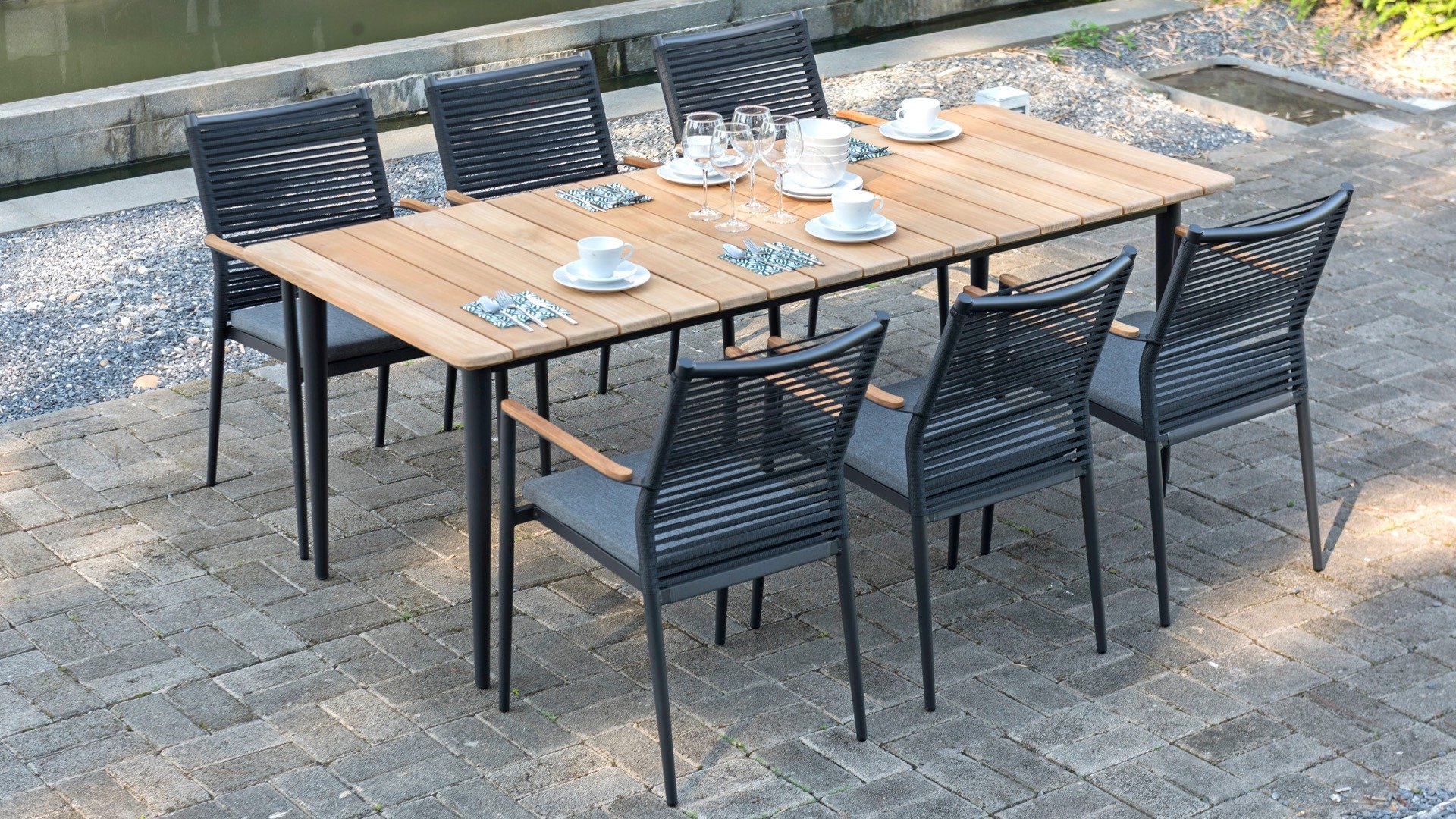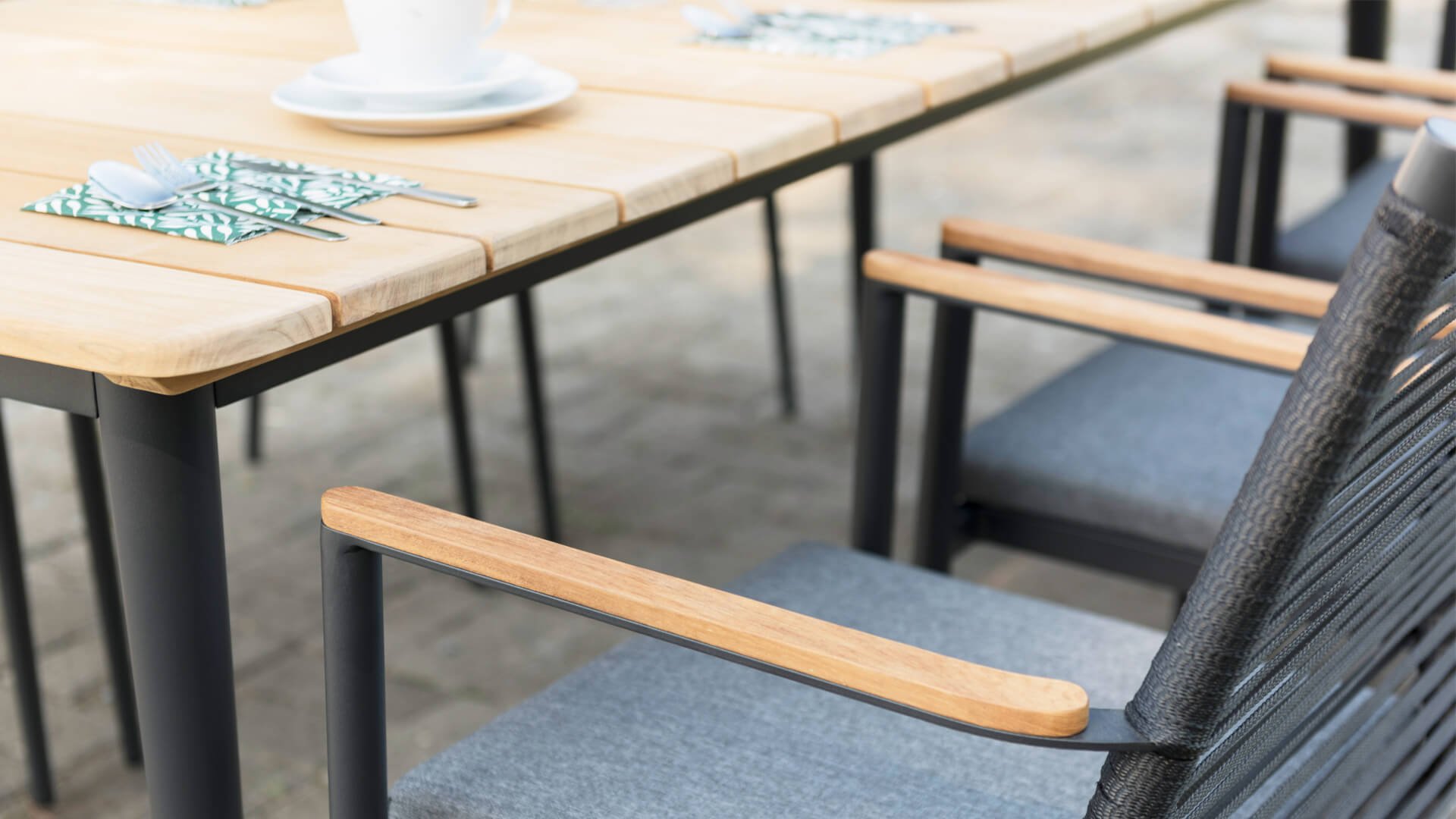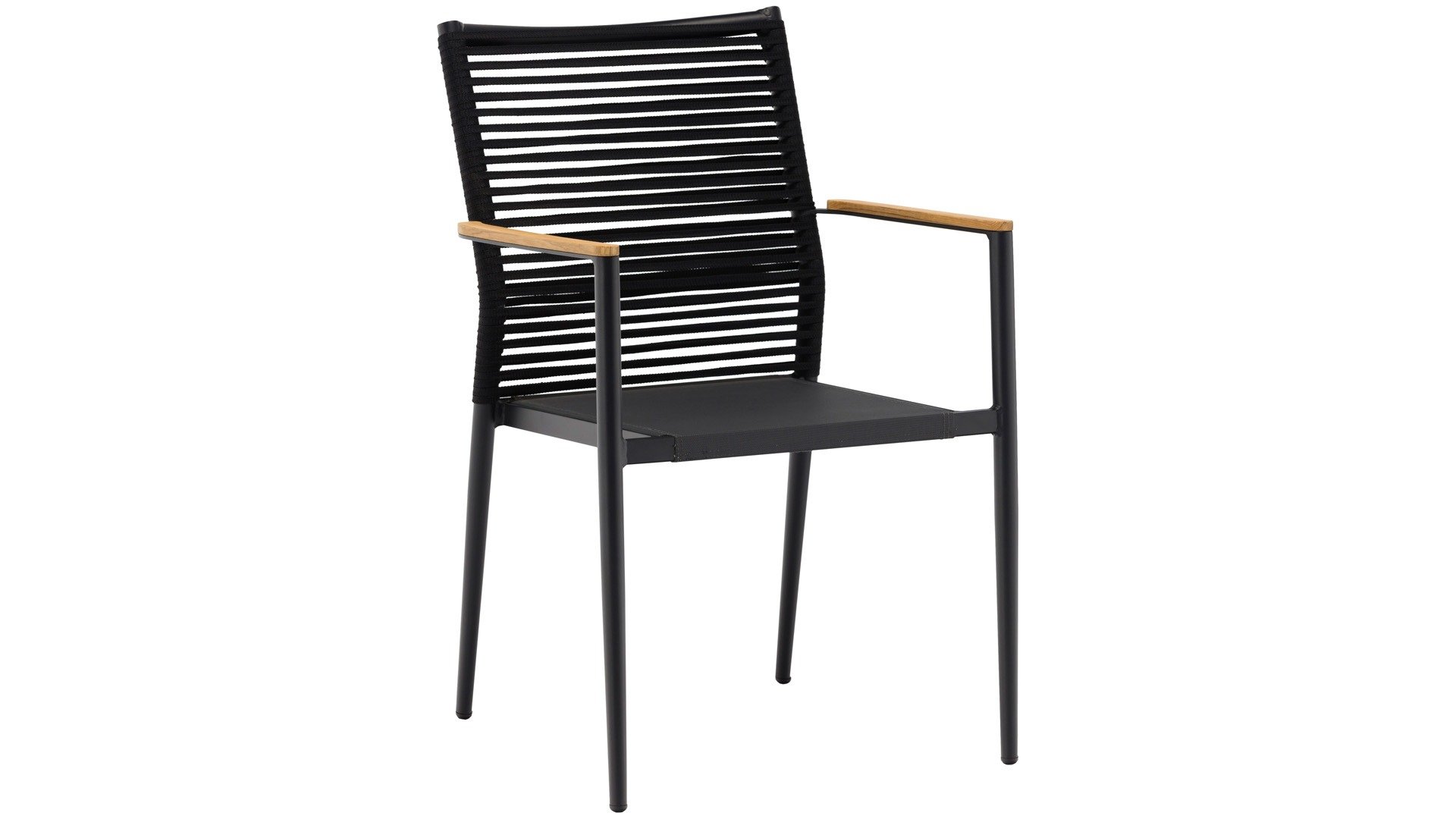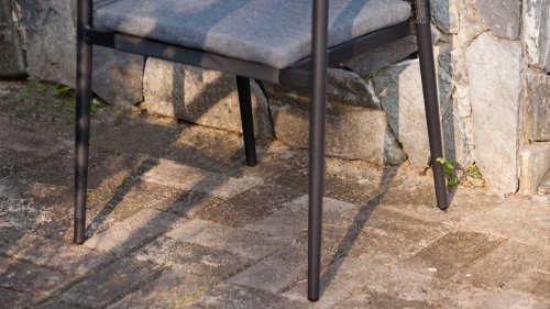 De Zebra Greenline Spider Dining serie. Een stapelbare stoel waarvan het frame bedekt is met gepoedercoat Graphite aluminium tezamen met Dark Grey gekleurde Batyline® stof. De Batyline® Textilene dat is gebruikt, is een bewezen synthetische stof die is ademend en scheurvast is voor meerdere jaren. De rug is van gemaakt van Rope, op de textilene zitting ligt een prettig zitkussen. De serie Greenline van Zebra combineert onder andere hedendaagse, ecologie en duurzaamheid met elkaar. In de corporate-concept Greenline is de kwestie van duurzaamheid en de selectie van milieuvriendelijke materialen.